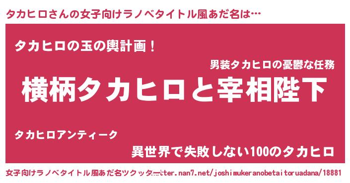 | 男性向けラノベタイトル風あだ名 | 『タカヒロに滅ぼされるだけの簡単なお仕事です』 |