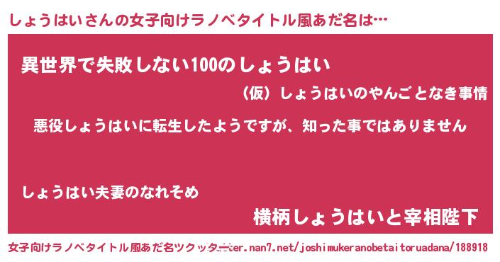 | 男性向けラノベタイトル風あだ名 | 『この素晴らしい世界にしょうはいを!』 |