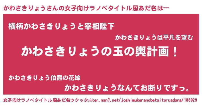 かわさきりょうさんの女子向けラノベタイトル風あだ名は… 『かわさきりょうの玉の輿計画!』『横柄かわさきりょうと宰相陛下』『かわさきりょうなんてお断りですっ。』 ツクッター #女子向けラノベタイトル風あだ名ツクッター http://tkutter.nan7.net/joshimukeranobetaitoruadana/188929/
