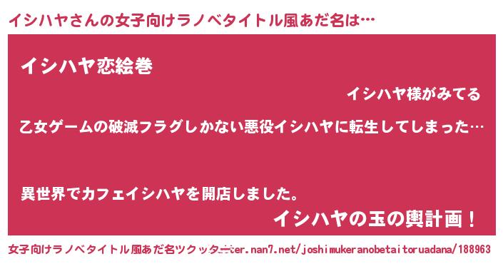 | ヒーロー風カッコイイあだ名 | 『仮面イシダー』『慈愛の使者イシハヤ』 |