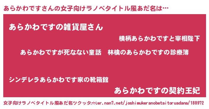 | 胡散臭い通販商品みたいなあだ名 | 『ハリウッド女優が絶賛した世界で10本だけ現存している希少なブランデー…その名も「あらかわです」』 |