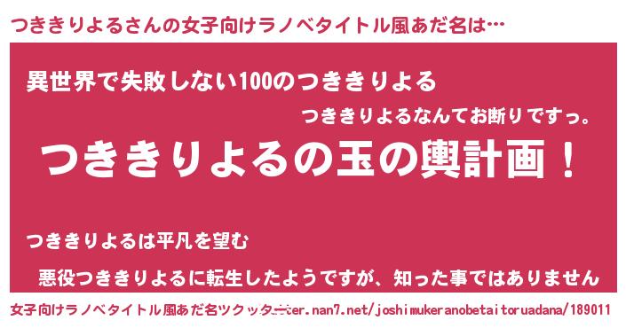 | 男性向けラノベタイトル風あだ名 | 『つききりよる~年齢イコール彼女いない歴の魔法使い~』 |