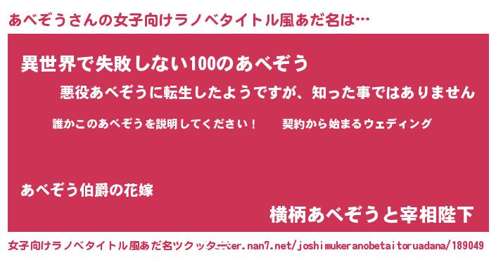 | 男性向けラノベタイトル風あだ名 | 『アベゾウアートオンライン』 |