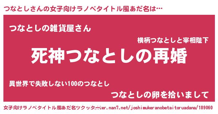 つなとしさんの女子向けラノベタイトル風あだ名は… 『死神つなとしの再婚』『つなとしの雑貨屋さん』『つなとしの卵を拾いまして』 ツクッター #女子向けラノベタイトル風あだ名ツクッター http://tkutter.nan7.net/joshimukeranobetaitoruadana/189060/