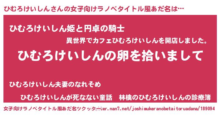 | 男性向けラノベタイトル風あだ名 | 『ダンジョンにひむろけいしんを求めるのは間違っているだろうか』 |