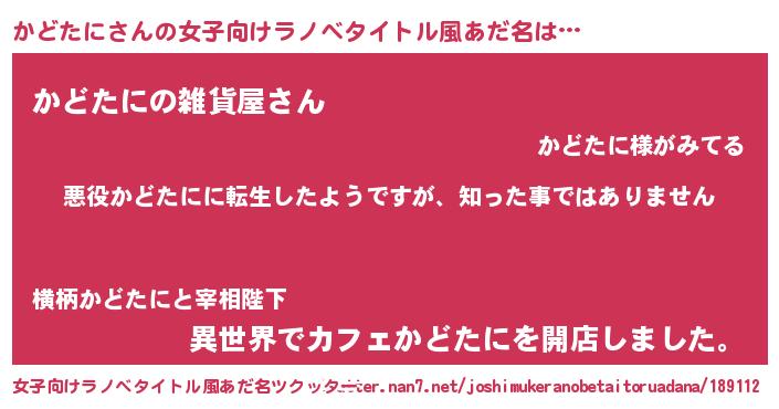 | 男性向けラノベタイトル風あだ名 | 『この素晴らしい世界にかどたにを!』 |