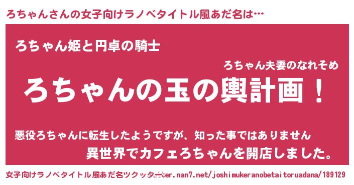 | 男性向けラノベタイトル風あだ名 | 『ろちゃん~年齢イコール彼女いない歴の魔法使い~』 |