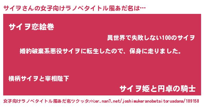 | 男性向けラノベタイトル風あだ名 | 『転生したらサイヲだった件』 |