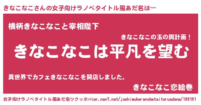 きなこなこさんの女子向けラノベタイトル風あだ名は… 『きなこなこは平凡を望む』『横柄きなこなこと宰相陛下』『きなこなこ恋絵巻』 ツクッター #女子向けラノベタイトル風あだ名ツクッター http://tkutter.nan7.net/joshimukeranobetaitoruadana/189191/