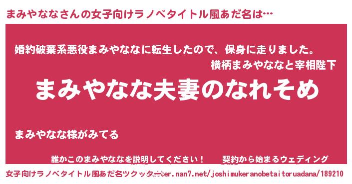 | 男性向けラノベタイトル風あだ名 | 『おまえをオタクにしてやるから、俺をまみやななにしてくれ! 』 |