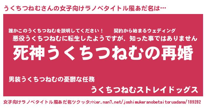 | 男性向けラノベタイトル風あだ名 | 『ノーゲーム・ノーウクチツネム』 |