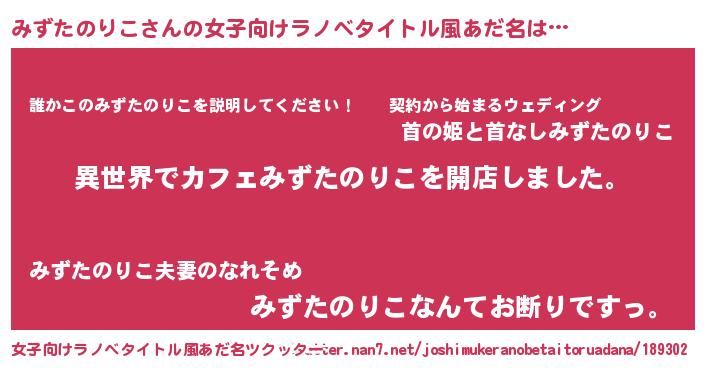 | 男性向けラノベタイトル風あだ名 | 『誰もが恐れるあのみずたのりこが、ぼくの専属メイドになるようです。』 |