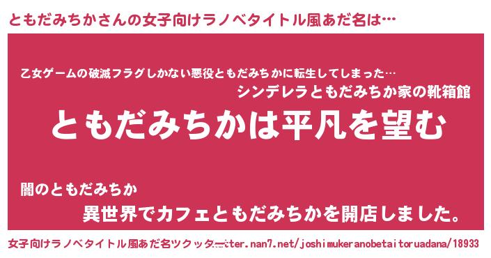| 胡散臭い通販商品みたいなあだ名 | 『信頼と実績のサプリメント…その名も「ともだみちか」』 |