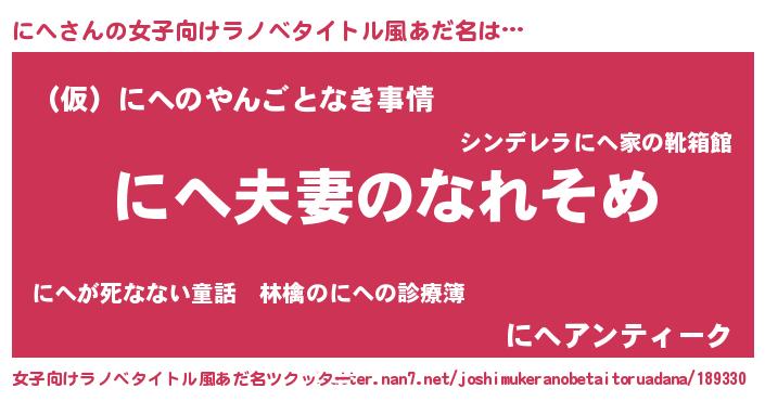 | 男性向けラノベタイトル風あだ名 | 『おまえをオタクにしてやるから、俺をにへにしてくれ! 』 |
