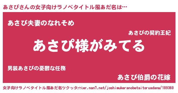| 男性向けラノベタイトル風あだ名 | 『あさぴの嫁は女の子じゃないと思った?』 |
