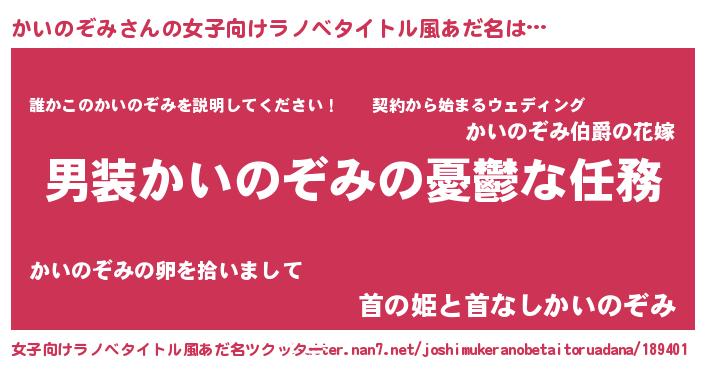| 男性向けラノベタイトル風あだ名 | 『うちのかいのぞみが世界を掌握している!』 |