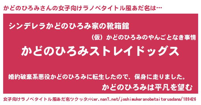 | 男性向けラノベタイトル風あだ名 | 『Re:かどのひろみから始める異世界生活』 |