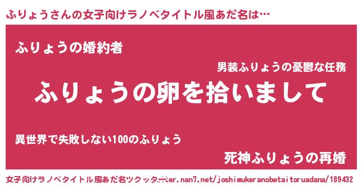 | 男性向けラノベタイトル風あだ名 | 『ふりょうの嫁は女の子じゃないと思った?』 |