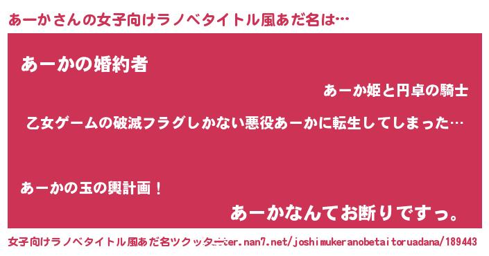 | 男性向けラノベタイトル風あだ名 | 『この素晴らしい世界にあーかを!』 |