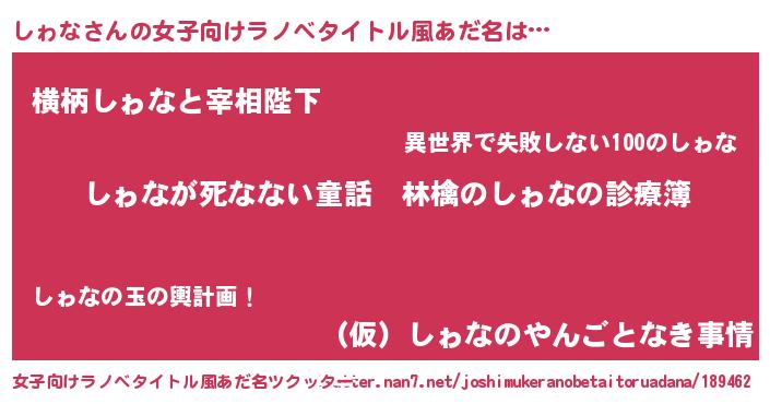| 男性向けラノベタイトル風あだ名 | 『魔弾の王としゎな』『しゎなの憂鬱』 |