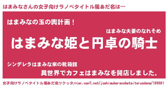 はまみなさんの女子向けラノベタイトル風あだ名は… 『はまみな姫と円卓の騎士』『はまみなの玉の輿計画!』『異世界でカフェはまみなを開店しました。』 ツクッター #女子向けラノベタイトル風あだ名ツクッター http://tkutter.nan7.net/joshimukeranobetaitoruadana/189581/