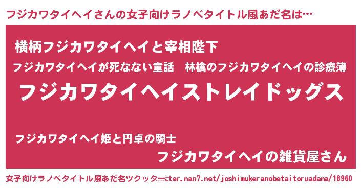 | 男性向けラノベタイトル風あだ名 | 『Re:フジカワタイヘイから始める異世界生活』 |