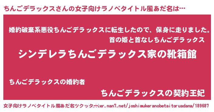 | 男性向けラノベタイトル風あだ名 | 『冴えないちんごデラックスの育てかた』 |