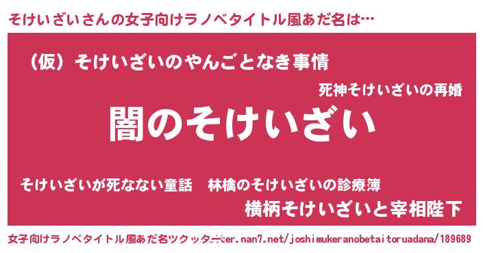| 男性向けラノベタイトル風あだ名 | 『Re:そけいざいから始める異世界生活』 |