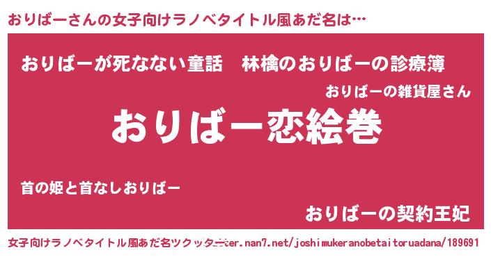 | 男性向けラノベタイトル風あだ名 | 『おまえをオタクにしてやるから、俺をおりばーにしてくれ! 』 |