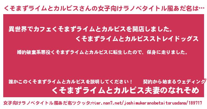 | 胡散臭い通販商品みたいなあだ名 | 『絶対に幸福をもたらす水素水…その名も「くそまずライムとカルビス」』 |