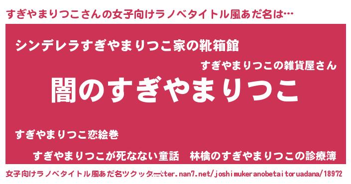 | 男性向けラノベタイトル風あだ名 | 『Re:すぎやまりつこから始める異世界生活』 |