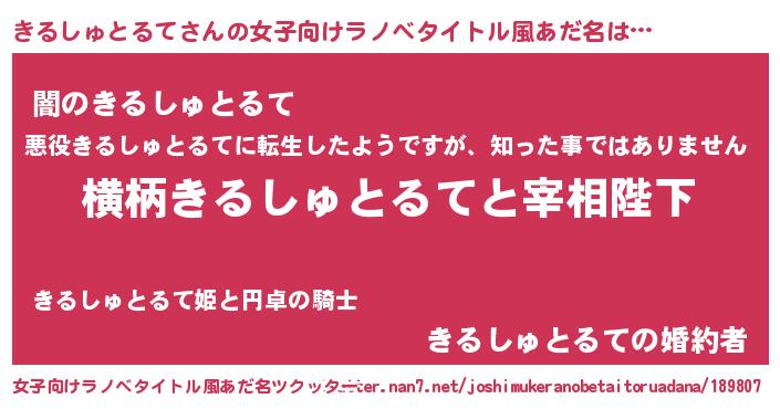 | 男性向けラノベタイトル風あだ名 | 『きるしゅとるてに滅ぼされるだけの簡単なお仕事です』 |
