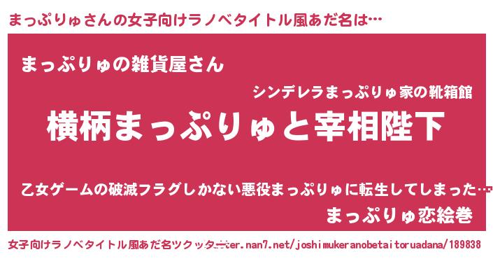| 男性向けラノベタイトル風あだ名 | 『まっぷりゅに滅ぼされるだけの簡単なお仕事です』 |