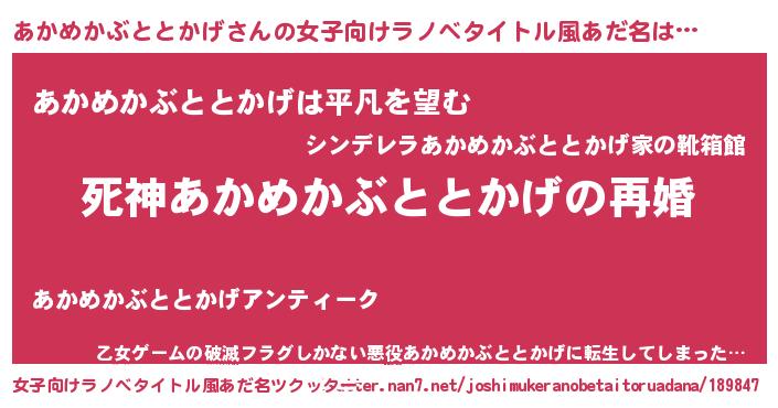 | 男性向けラノベタイトル風あだ名 | 『ノーゲーム・ノーアカメカブトトカゲ』 |