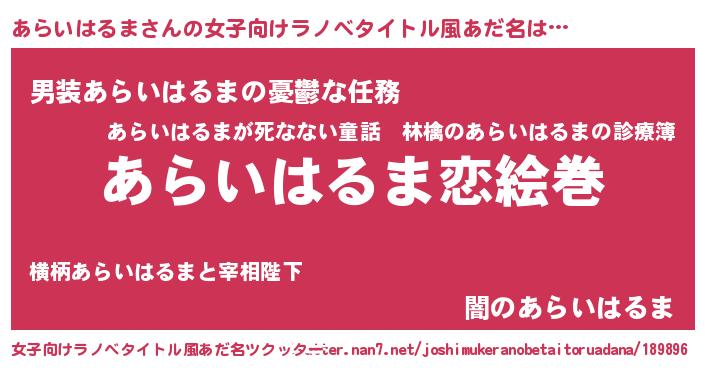 | 男性向けラノベタイトル風あだ名 | 『おまえをオタクにしてやるから、俺をあらいはるまにしてくれ! 』 |