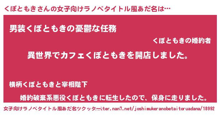 | 男性向けラノベタイトル風あだ名 | 『誰もが恐れるあのくぼともきが、ぼくの専属メイドになるようです。』 |