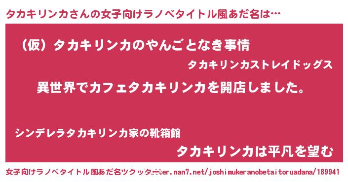| 男性向けラノベタイトル風あだ名 | 『誰もが恐れるあのタカキリンカが、ぼくの専属メイドになるようです。』 |