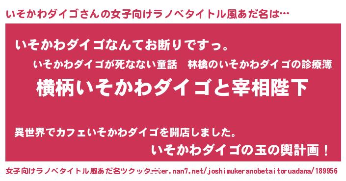 | 男性向けラノベタイトル風あだ名 | 『いそかわダイゴに滅ぼされるだけの簡単なお仕事です』 |