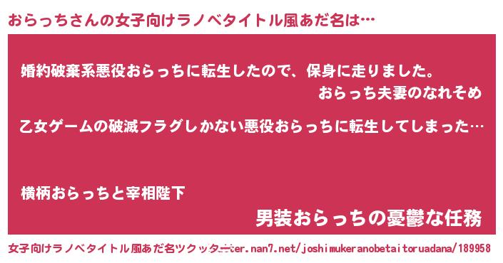| 男性向けラノベタイトル風あだ名 | 『この素晴らしい世界におらっちを!』 |
