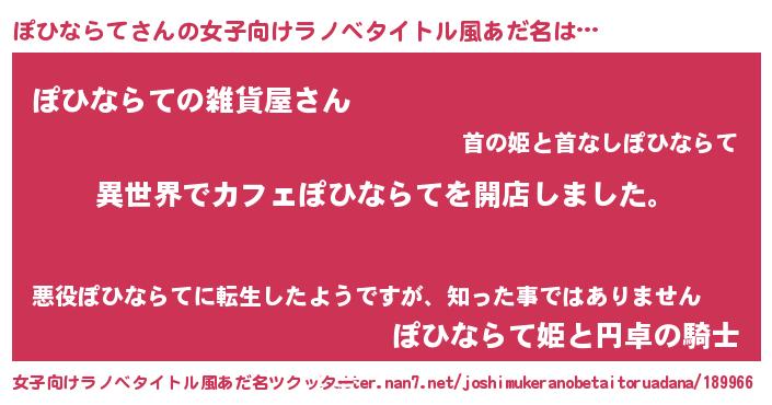 | 男性向けラノベタイトル風あだ名 | 『誰もが恐れるあのぽひならてが、ぼくの専属メイドになるようです。』 |