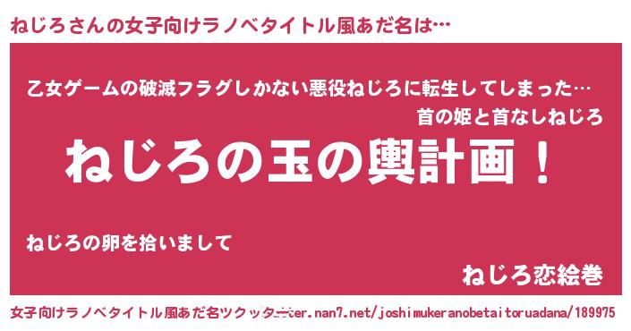 | 男性向けラノベタイトル風あだ名 | 『ねじろ~年齢イコール彼女いない歴の魔法使い~』 |