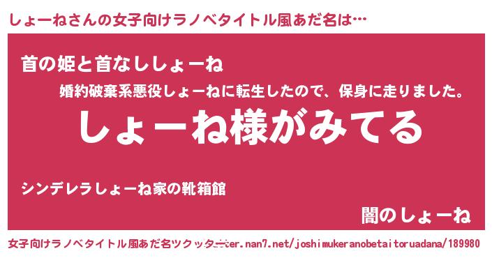 しょーねさんの女子向けラノベタイトル風あだ名は… 『しょーね様がみてる』『首の姫と首なししょーね』『闇のしょーね』 ツクッター #女子向けラノベタイトル風あだ名ツクッター http://tkutter.nan7.net/joshimukeranobetaitoruadana/189980/