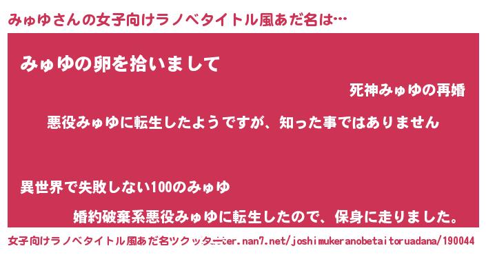| 胡散臭い通販商品みたいなあだ名 | 『あなたにだけ特別に提供する100年もののヴィンテージワイン…その名も「みゅゆ」』 |