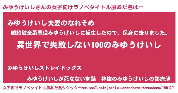 | 男性向けラノベタイトル風あだ名 | 『みゆうけいしという概念が存在しない退屈な世界 』 |