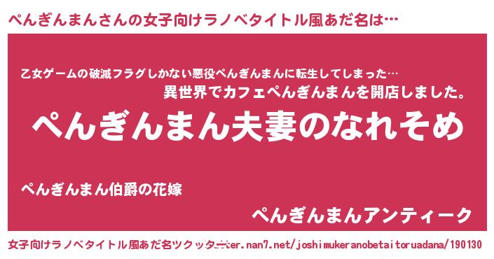 | 男性向けラノベタイトル風あだ名 | 『おまえをオタクにしてやるから、俺をぺんぎんまんにしてくれ! 』 |