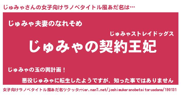 | 男性向けラノベタイトル風あだ名 | 『誰もが恐れるあのじゅみゃが、ぼくの専属メイドになるようです。』 |