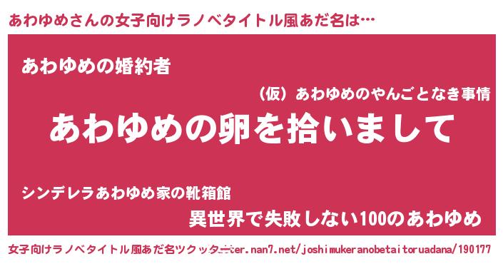 | 男性向けラノベタイトル風あだ名 | 『あわゆめの嫁は女の子じゃないと思った?』 |