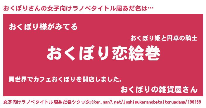 | 男性向けラノベタイトル風あだ名 | 『おまえをオタクにしてやるから、俺をおくぼりにしてくれ! 』 |