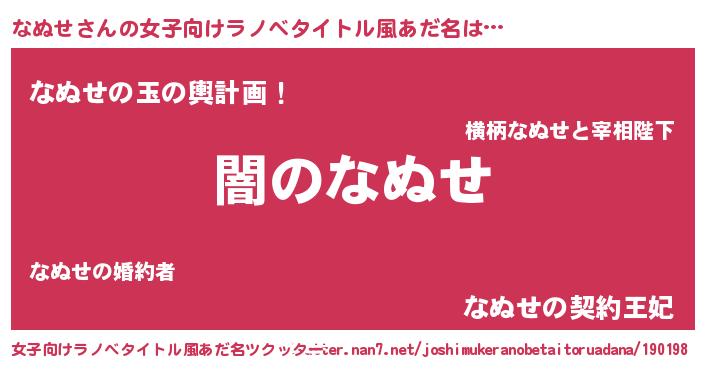 | 男性向けラノベタイトル風あだ名 | 『Re:なぬせから始める異世界生活』 |