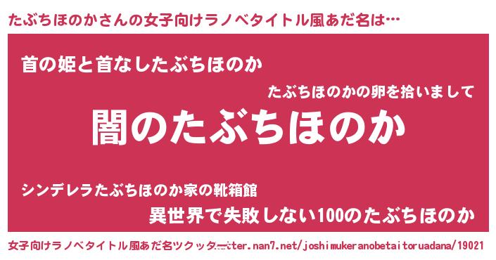 | 男性向けラノベタイトル風あだ名 | 『Re:たぶちほのかから始める異世界生活』 |